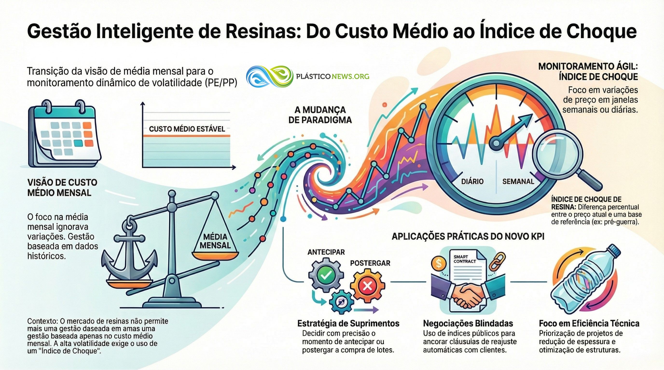Antes, muitos convertedores olhavam a resina sobretudo como um número médio mensal: “quanto paguei, em média, pelo kg de PE/PP no mês”. Isso continua importante, mas o jogo mudou. Em um cenário em que cartas de aumento podem adicionar dezenas de pontos percentuais de um mês para outro, o KPI crítico passa a ser a variação de preço em janelas curtas – semanais ou até diárias, dependendo da exposição.