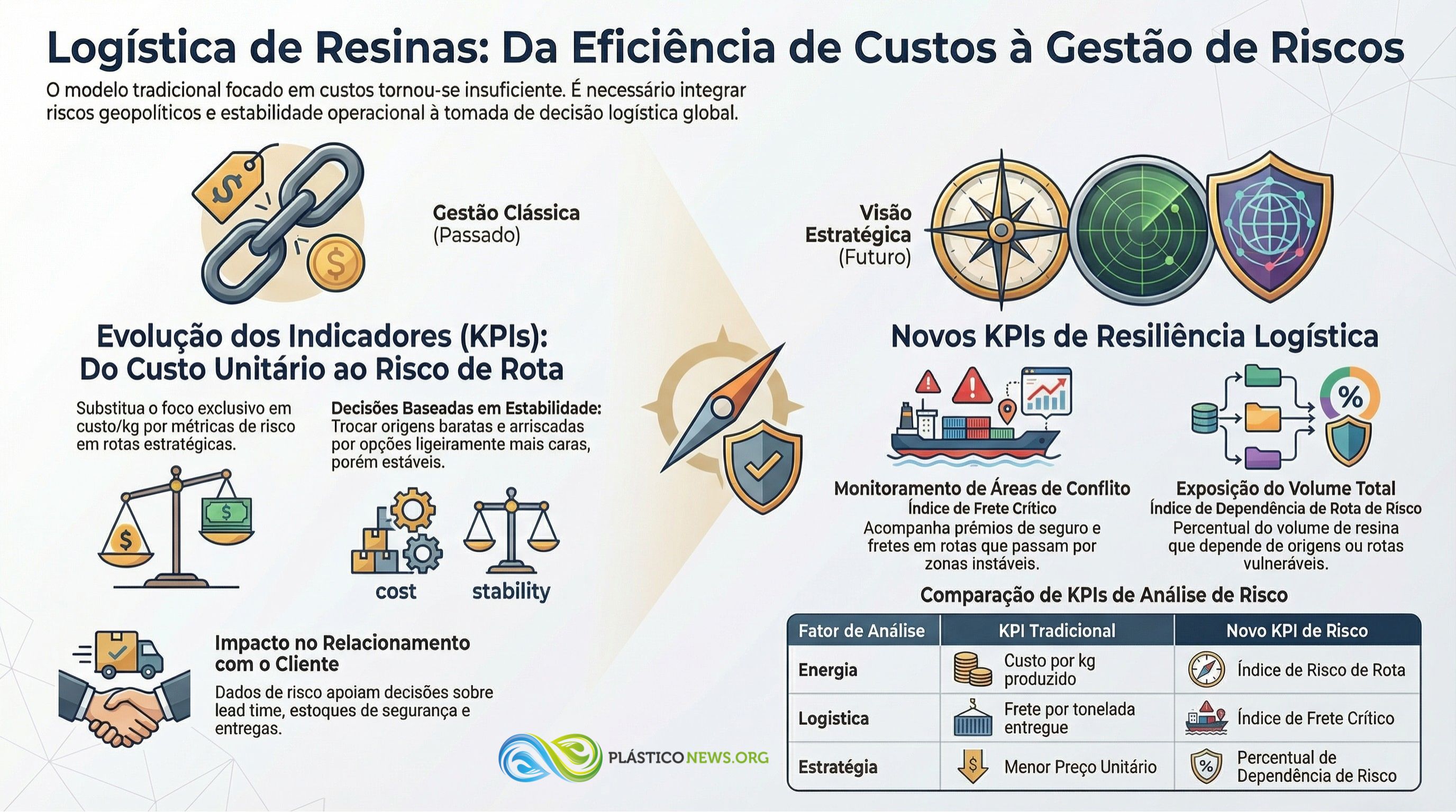 Na gestão clássica, energia entra como custo por kg produzido, e logística como custo de frete por tonelada entregue. Com rotas marítimas sob pressão, esses KPIs precisam ganhar uma camada adicional: acompanhar indicadores de risco e custo em rotas estratégicas que ligam produtores de resina ao seu porto.