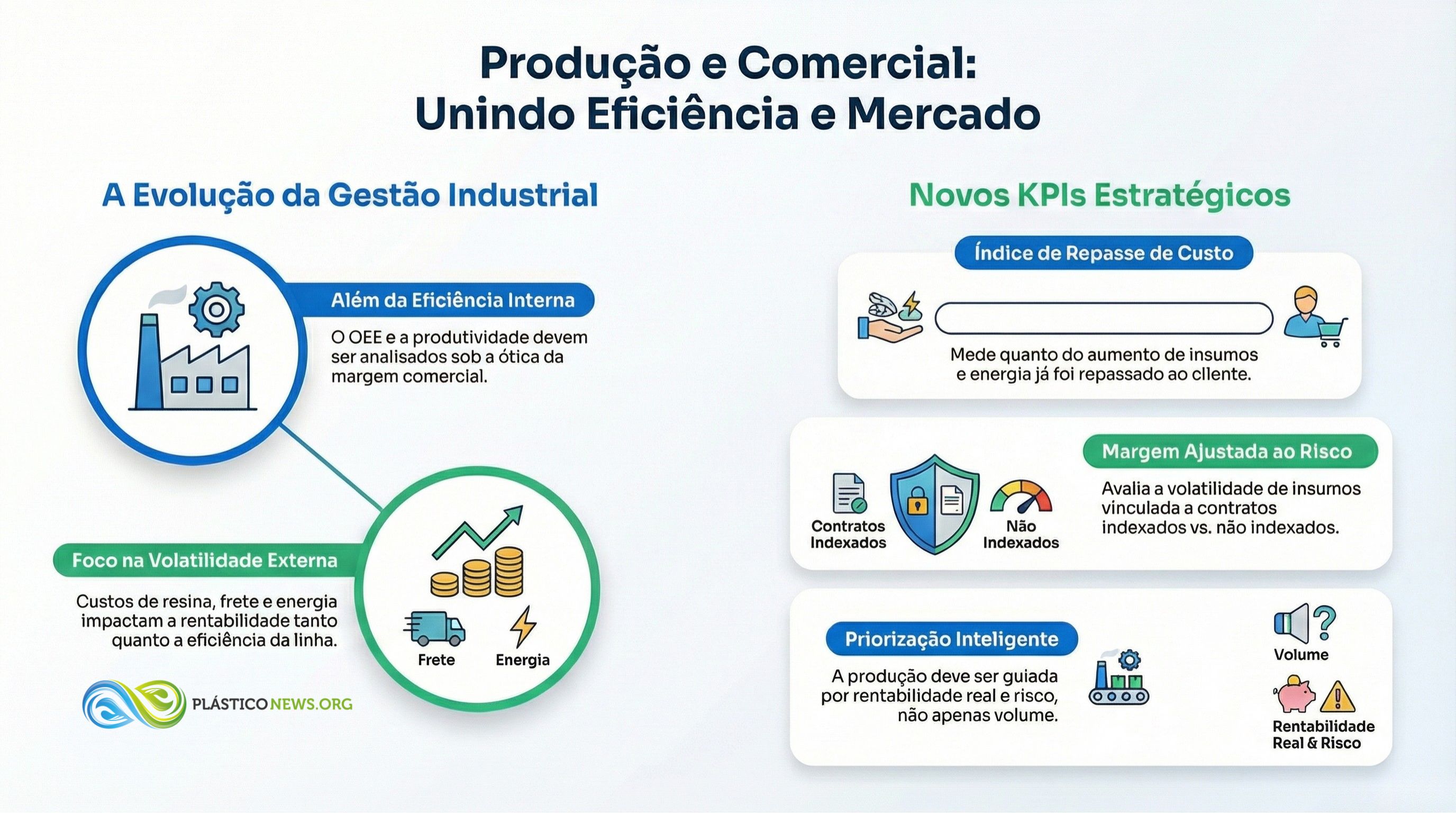 O OEE, a produtividade das linhas e a taxa de refugo seguem sendo o coração operacional do converter. A mudança está em como esses KPIs conversam com o lado comercial e com o mercado. Em vez de enxergar margem por cliente apenas como função de preço e custos internos, passa a ser essencial incluí-la em um contexto de volatilidade externa.