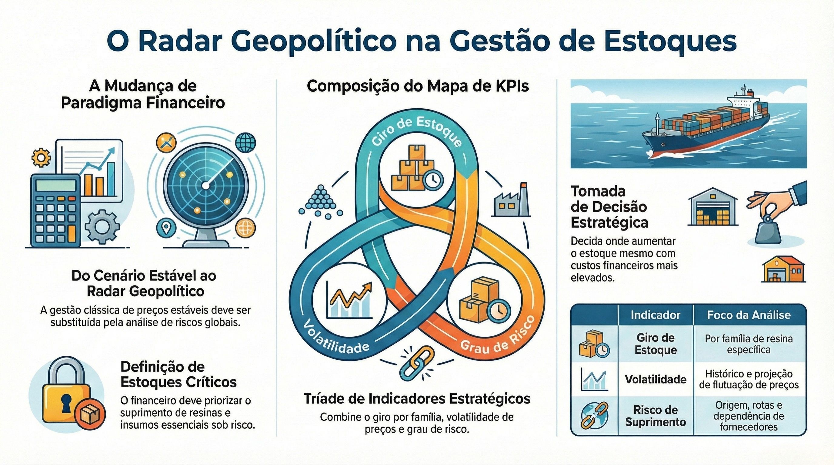No modo clássico, giro de estoque e capital de giro necessário são calculados com base em um cenário relativamente estável de preço e oferta. Em contexto de guerra, o financeiro precisa incorporar um “radar geopolítico” básico na definição de estoques de resina e insumos críticos.