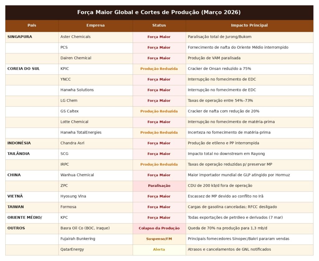 Uma tabela de “força maior e cortes de produção globais” de março de 2026, que circulou entre clientes e fornecedores, ilustra o tamanho da quebra de oferta. Em Singapura, empresas químicas importantes declararam força maior, citando paralisação completa de complexos industriais, interrupção do fornecimento de nafta vinda do Oriente Médio e parada na produção de monômeros e intermediários estratégicos.