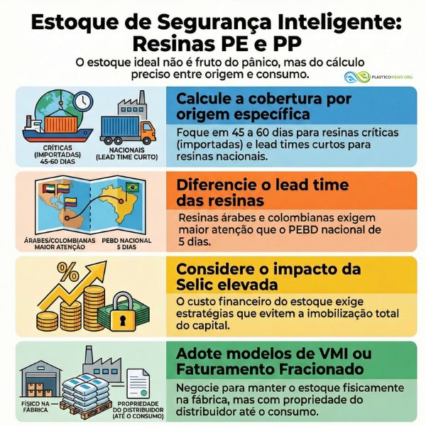 Não é compra em pânico. É calcular o consumo mensal de PE e PP por especificação, mapear o pior lead time de cada origem e montar cobertura de 45 a 60 dias para as resinas críticas — especialmente as de origem árabe e colombiana. O erro comum é aplicar o mesmo critério a todas as resinas: PEBD de origem nacional tem lead time de 5 dias e não justifica o mesmo nível de estoque que PP importado.