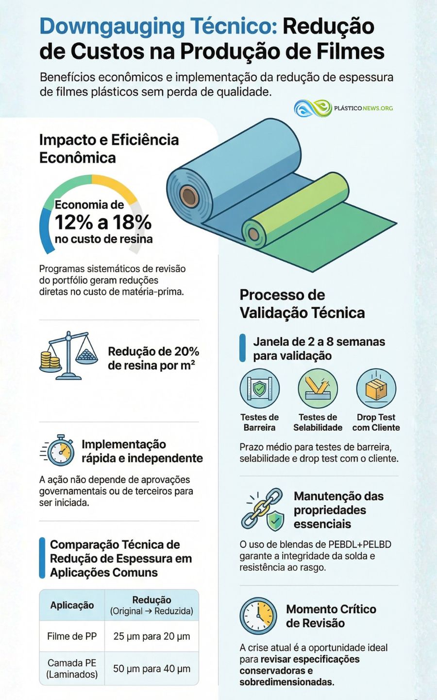 Downgauging — redução da espessura do filme mantendo as propriedades funcionais essenciais — é provavelmente a ação com melhor relação entre rapidez de implementação e impacto direto no custo. Não depende de terceiros, não exige aprovação governamental.