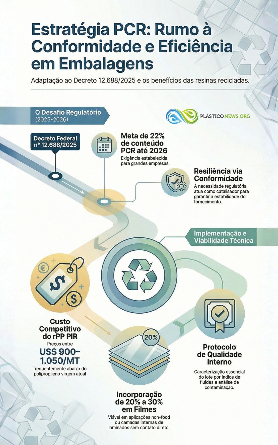O Decreto Federal nº 12.688/2025 obriga grandes empresas a 22% de conteúdo PCR em embalagens plásticas a partir de 2026. Para quem ainda não iniciou, a crise é catalisador duplo: a necessidade de conformidade regulatória transforma-se em instrumento de resiliência de fornecimento.