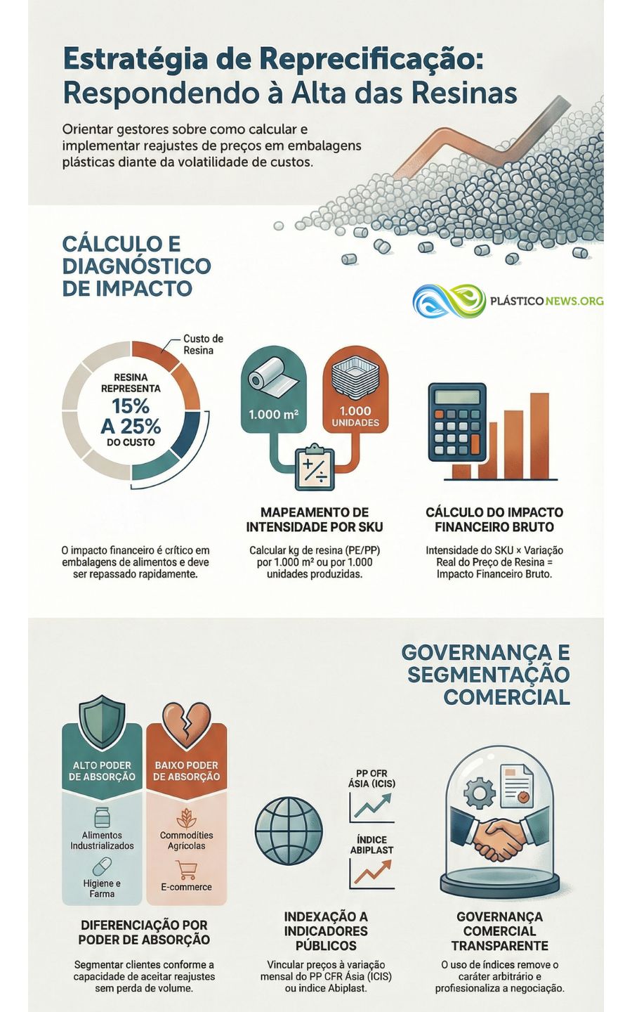 A segmentação por cliente é essencial: embalagens para alimentos industrializados, higiene e farmacêuticos têm maior poder de absorção de reajuste; commodities agrícolas e e-commerce têm menor. A política de reajuste deve ser vinculada a um índice público verificável — a variação mensal do PP CFR Ásia (ICIS) ou o índice da Abiplast. Isso retira o caráter arbitrário do reajuste e cria um protocolo claro de governança comercial.