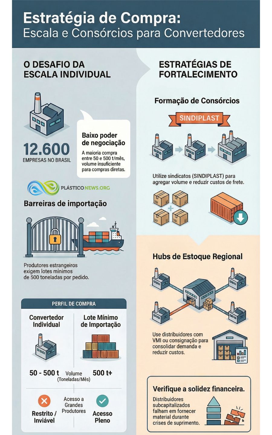 O Brasil tem 12.600 empresas de transformação plástica. A grande maioria compra entre 50 e 500 t/mês de resina — insuficiente para negociar diretamente com os fornecedores de resinas em condições diferenciadas ou para acessar importações de produtores que exigem lotes mínimos de 500 toneladas. Consórcios de compra viabilizados por associações setoriais — Sindicatos da Indústria de Material Plástico estaduais (SINDIPLAST) ou entidades regionais — permitem agregar volume, reduzir frete e seguro, e acessar origens individualmente inviáveis.