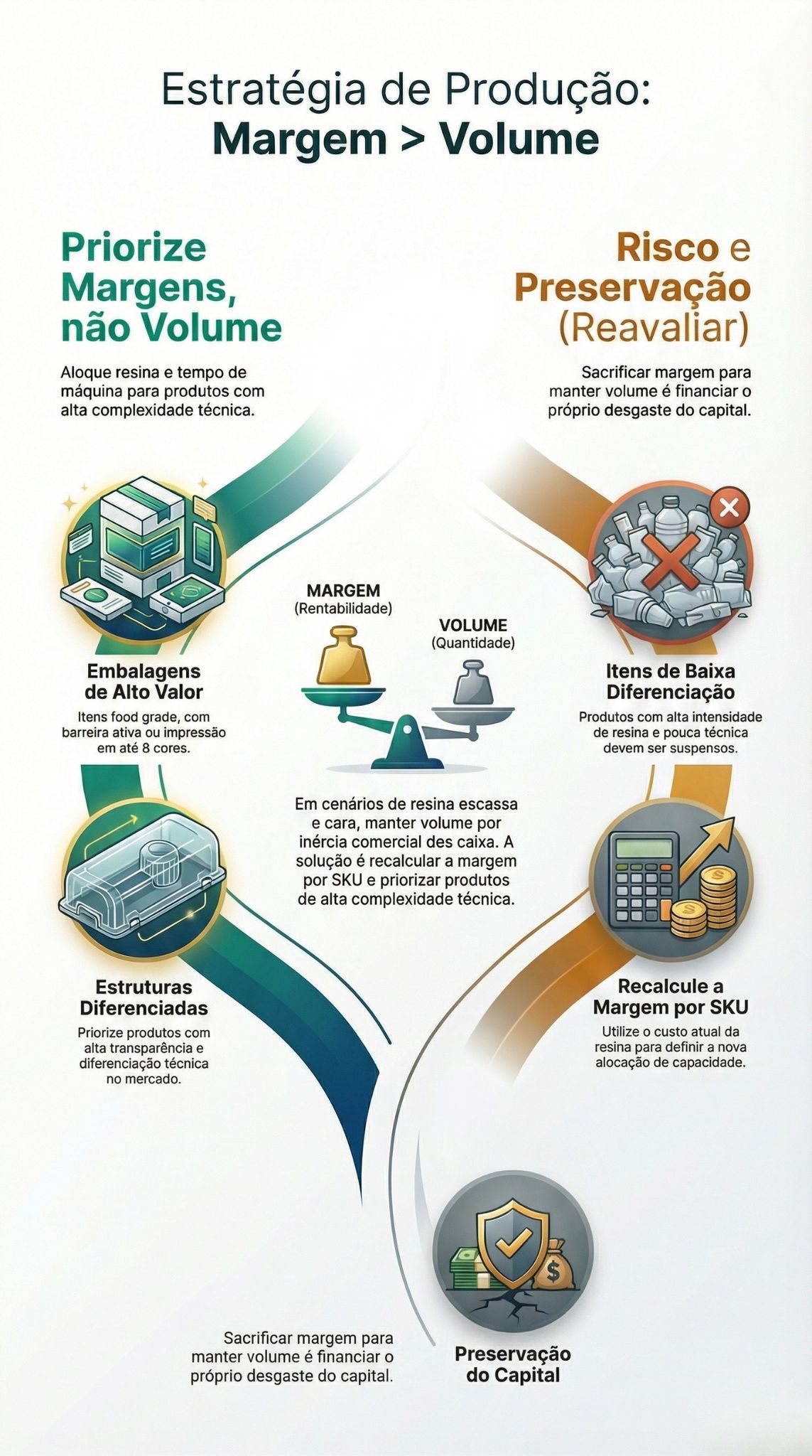 Em ambiente de resina escassa e cara, manter a mesma curva de produção por inércia comercial destrói caixa. Recalcule a margem de contribuição de cada SKU com o custo de resina atual, classifique o portfólio e tome decisões de alocação de capacidade a partir daí. Embalagens com alta complexidade técnica — food grade com barreira ativa, impressão flexográfica ou roto em 8 cores, estruturas de alta transparência — costumam ter margens mais altas e devem receber prioridade na alocação de resina e tempo de máquina. Itens de baixa complexidade, alta intensidade de resina e pouca diferenciação são candidatos à suspensão temporária ou ao reajuste imediato.